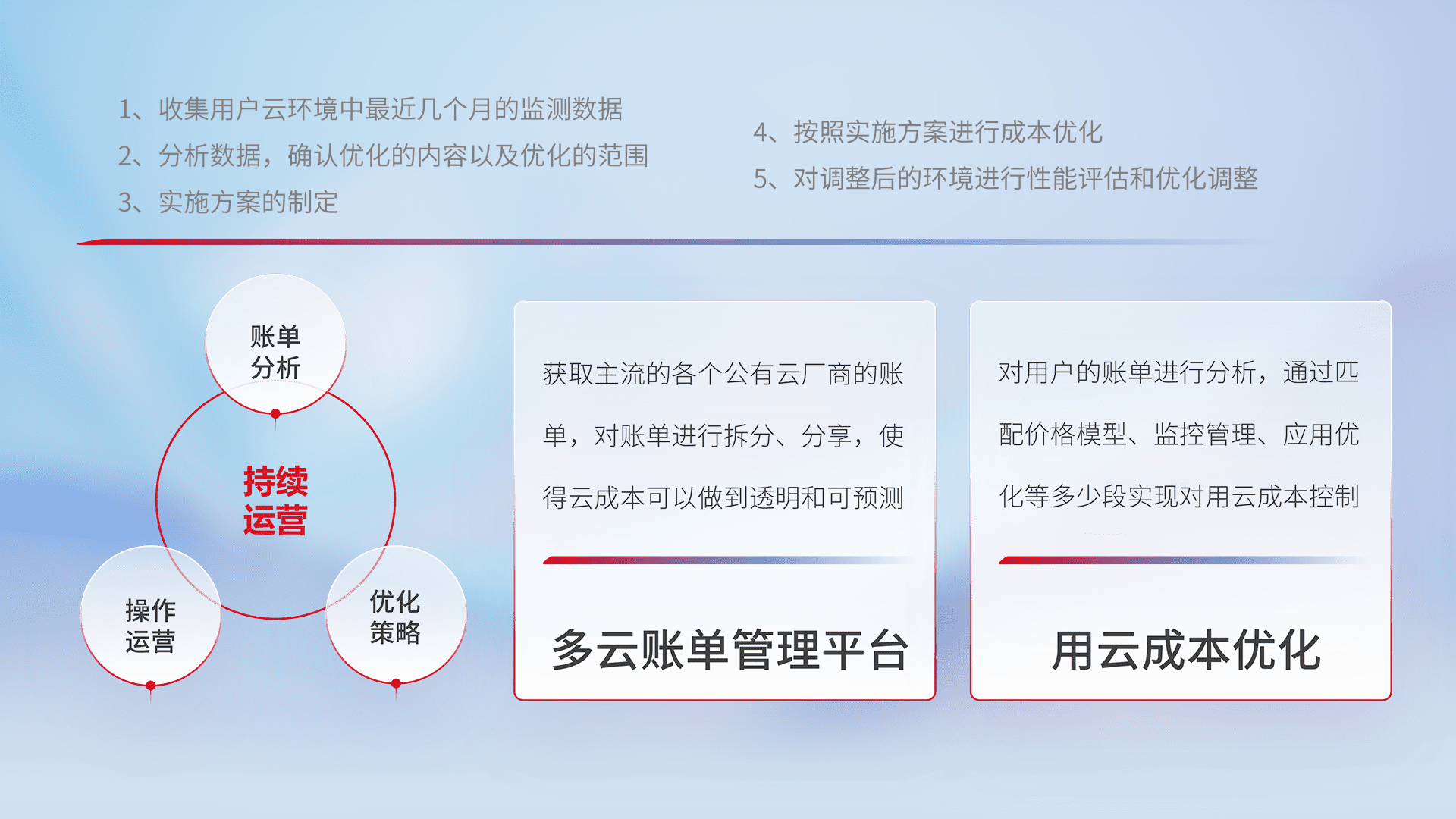 通过多云纳管,,,以统一的资源数据模型把客户的云资源进行抽象和封装,,进而实现对多云资源的统一操作,,,,保障云资源管理的可靠性、、、稳定性与可用性。。。量身定制化运维内容,,,配置、、、开发运维、、、补丁管理、、、备份、、、、监控、、、认证和访问管理、、、、审计和日常巡检等,,,,保障在用云过程中的可靠度,,,稳定度以及高可用率。。。。