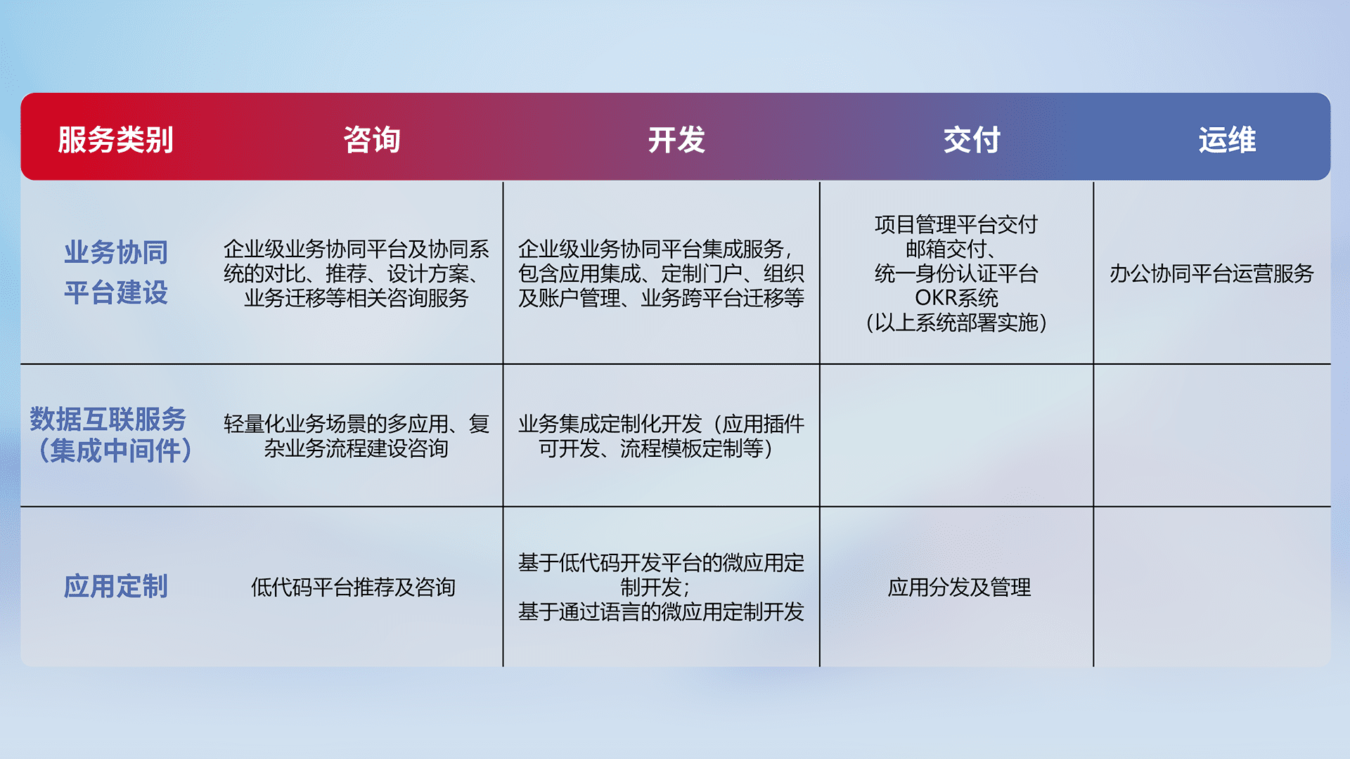 针对钉钉、、、、企微、、IDaas等平台级产品提供产品的规划、、方案、、交付、、、、定制化开发等服务,,,实现如统一协同办公、、智能客户服务、、、混合会议管理、、、智能数据查询、、、等业务场景,,,,实现数字化转型。。。。